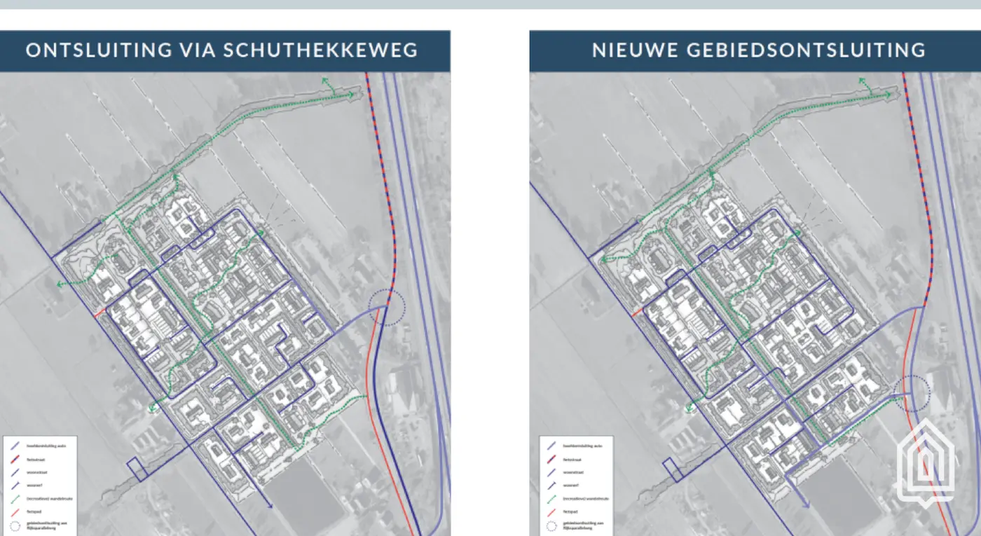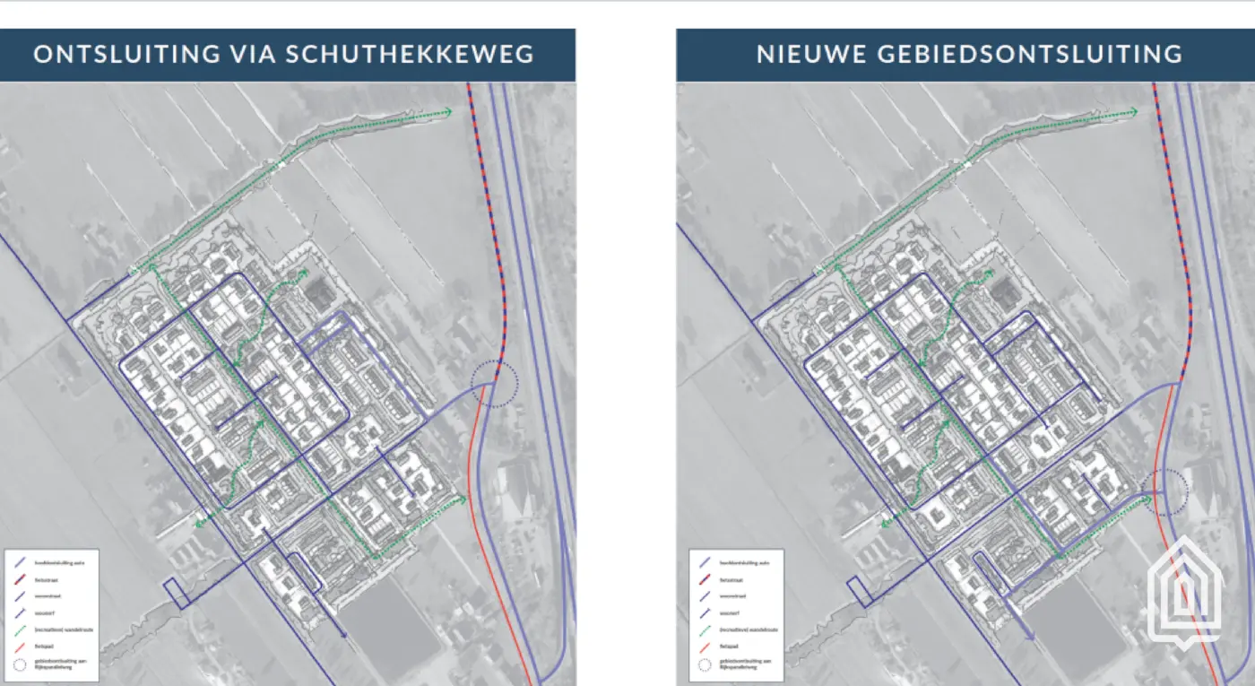 We hebben twee modellen voor de stedenbouwkundige opzet voor woningbouw aan de Schuthekkeweg aan u voorgelegd. In model A zijn de woonbuurten vooral als woonlinten ontworpen, met daarnaast enkele woonerven. In model B zijn de verschillende woonvormen bedacht als landschappelijke woonerven langs de Schuthekkeweg en de Olde Kerkhofsweg. Beide modellen hebben centraal een slingerend groen lint als verbinding tussen de oostkant en de basisschool. Voor de ontsluiting zijn twee verkeersvarianten geschetst. Met alleen een ontsluiting via de Schuthekkeweg of met een extra ontsluiting naar de Rijksparallelweg ter hoogte van de Lidl. Deze route verbindt de nieuwe woonbuurten en ook de bestaande manege.